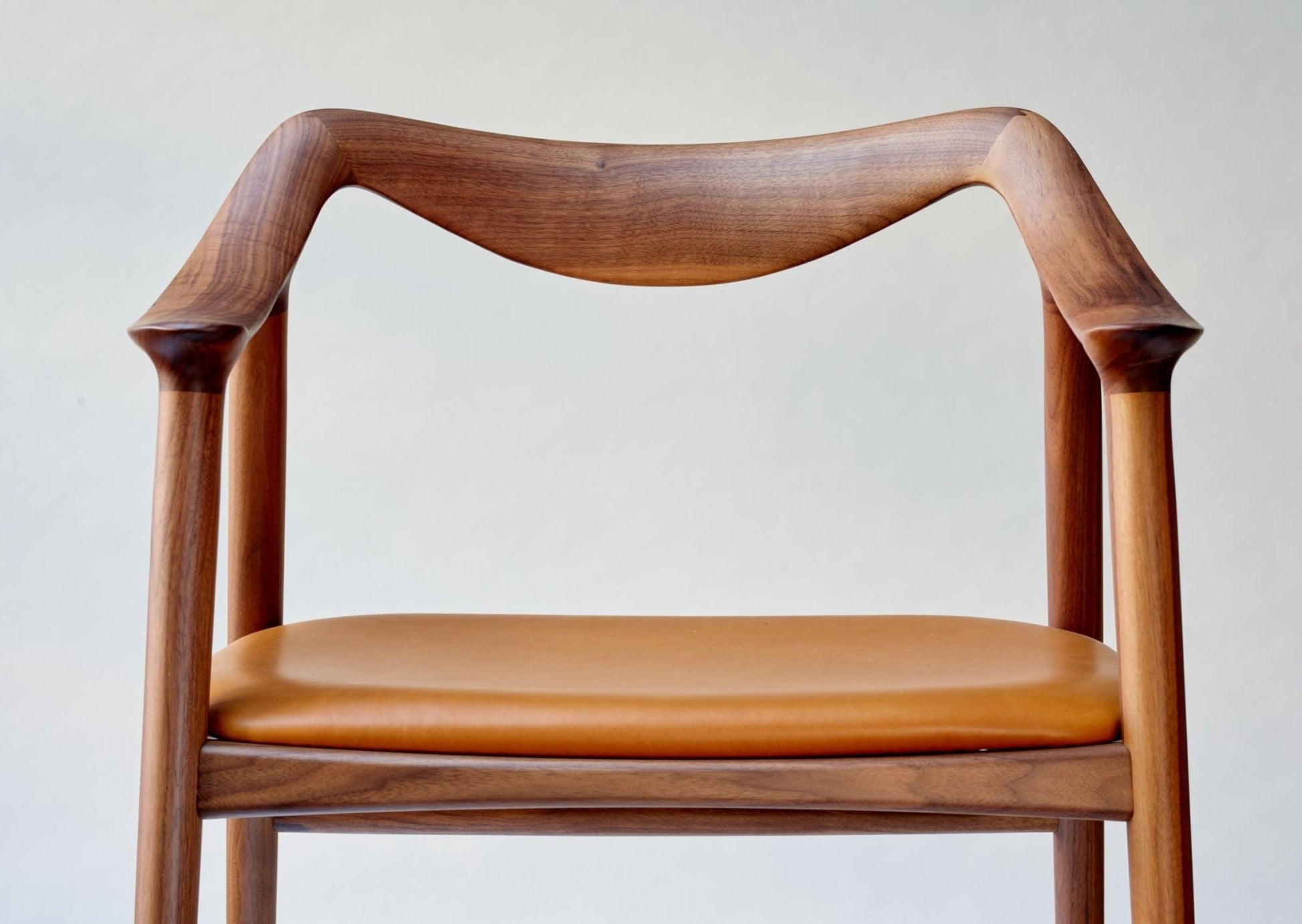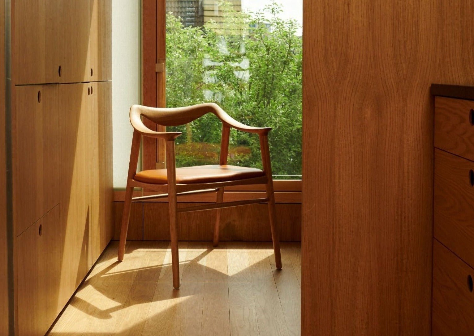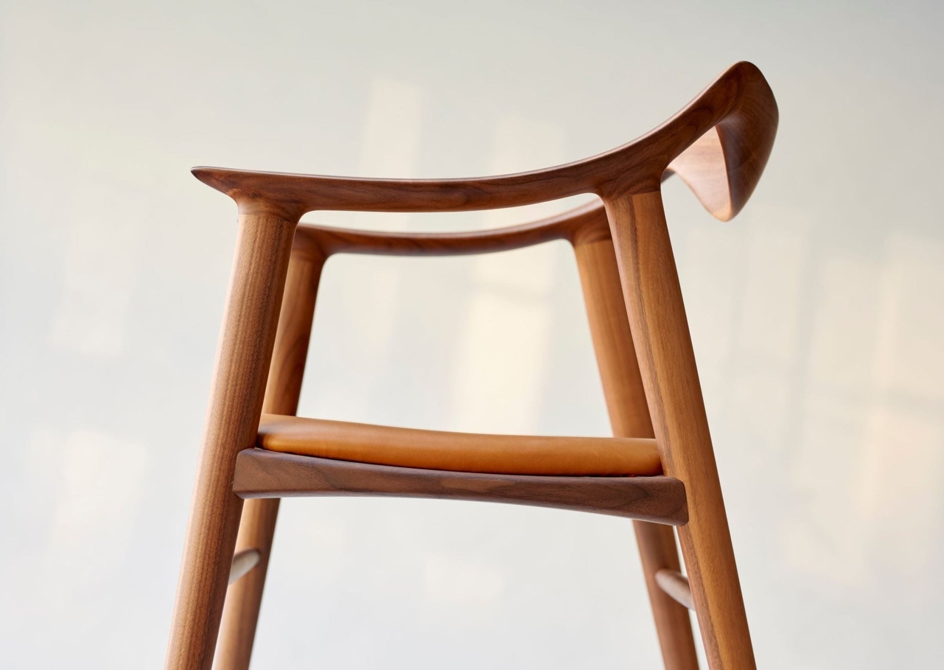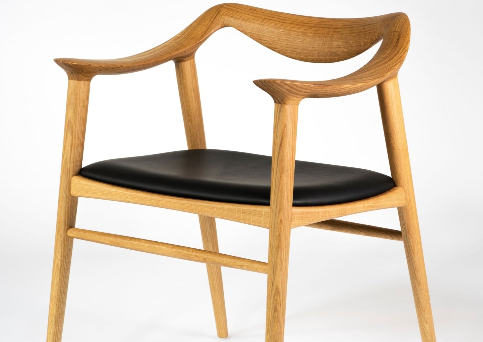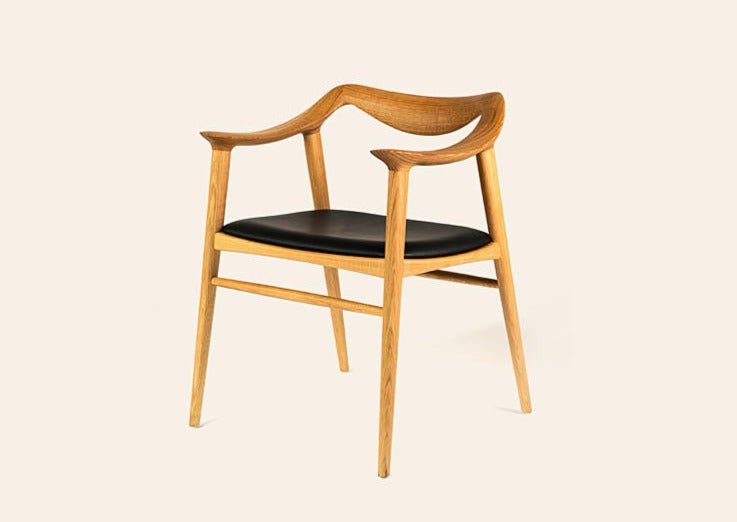 Spisestol i heltre eik eller valnøtt med stoppet sete i 2 typer skinn.