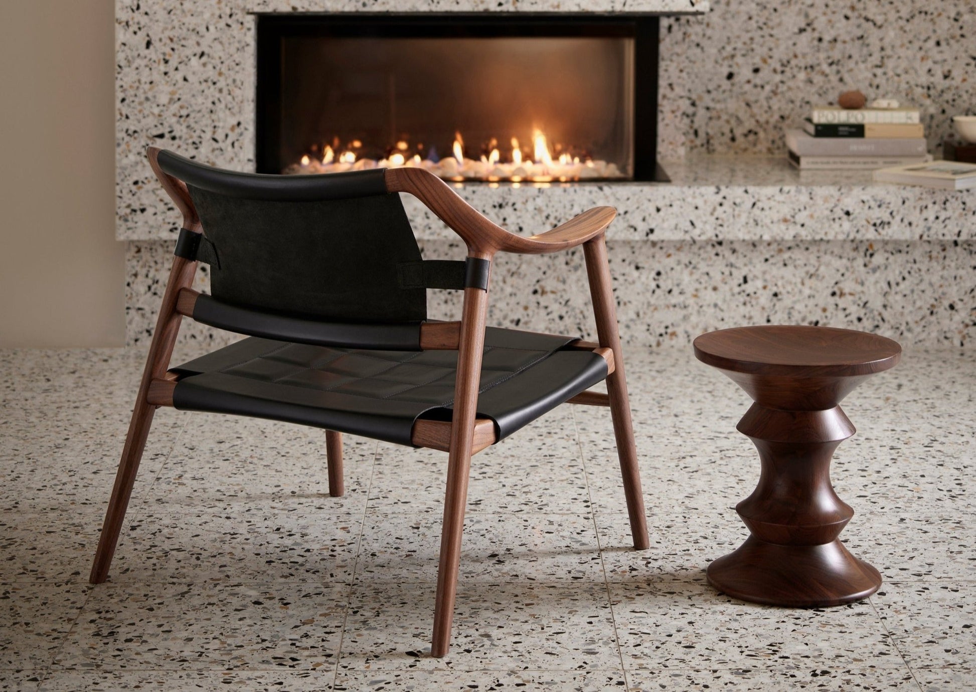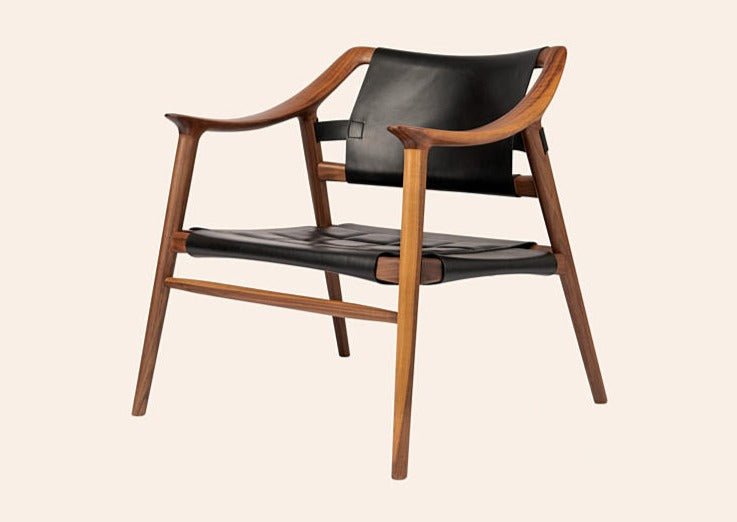 Loungestol i heltre eik eller valnøtt med sete og rygg i sort eller natur farget skinn.